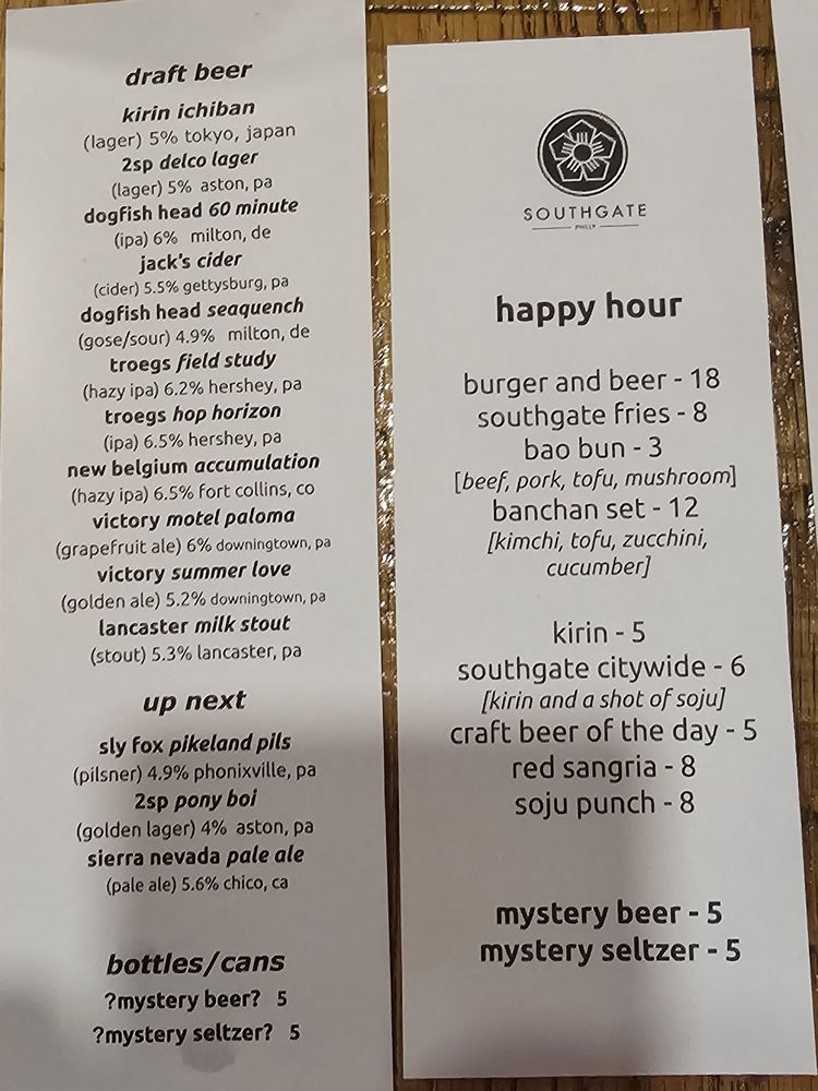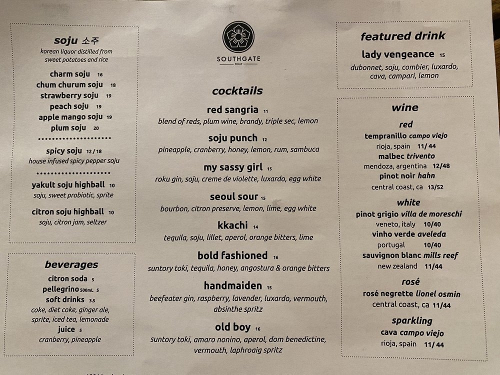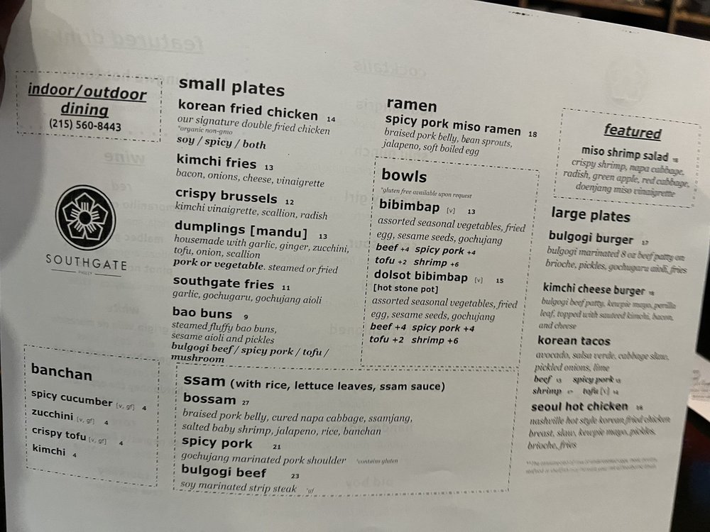 Southgate, located in Philadelphia, is a unique gastropub offering a fusion of American and Korean cuisine. With a wide range of options including vegan and vegetarian dishes, Southgate caters to a diverse audience. From their popular Rice Cake Dumpling Soup to their flavorful Pork Belly Bossam, each dish showcases a perfect blend of traditional Korean flavors with a modern twist. The restaurant's relaxed atmosphere, coupled with features like outdoor seating and happy hour specials, make it a great spot for group gatherings or a casual dinner. Southgate truly stands out with their innovative dishes and commitment to providing a memorable dining experience.